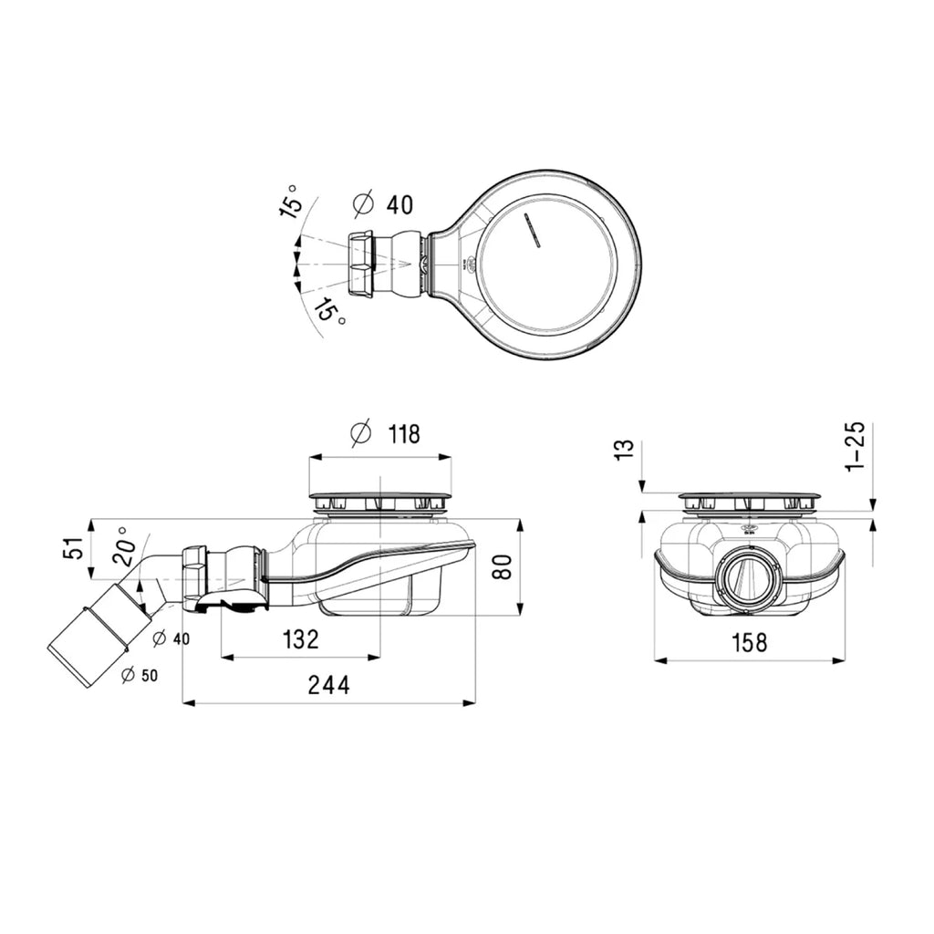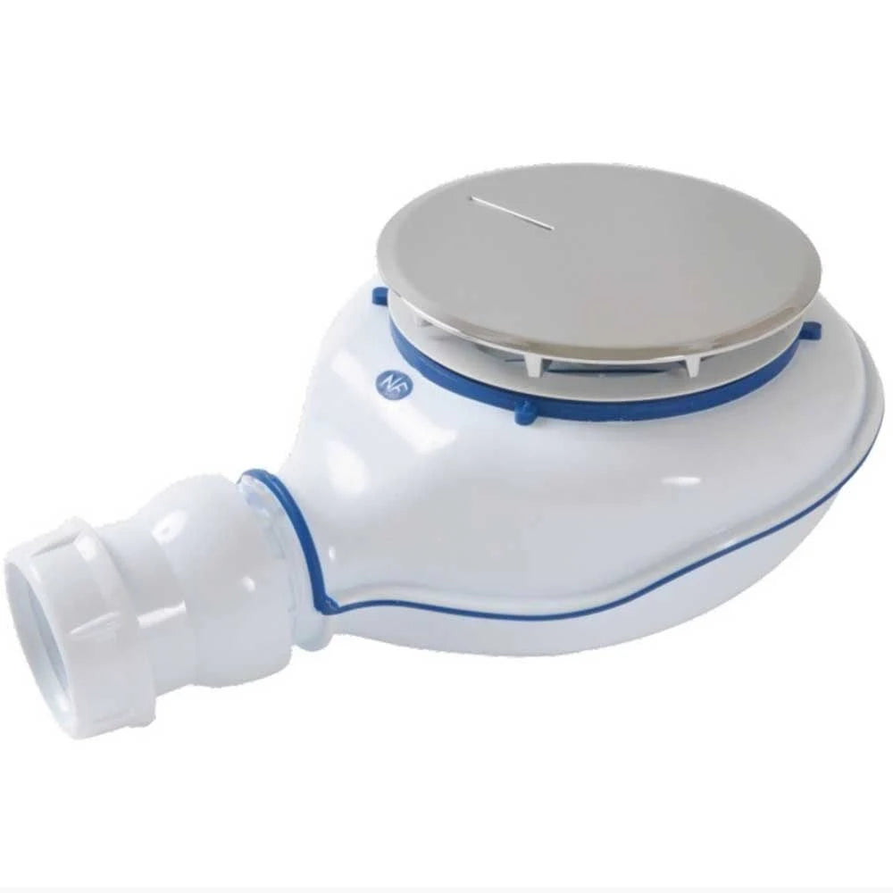 This is a high-capacity, trapped shower tray waste designed for shower trays with a 90 mm waste hole. It uses a compact polypropylene body with integrated seals and features a chrome-plated ABS domed cover with an etched finish for a sleek, modern look. The waste is especially suited for ultra-low or slimline shower trays. It offers top-access for easy cleaning and a swivel outlet that can be aligned horizontally (≈ 30°) or vertically downward (≈ 20°). Flow rate is approximately 43 litres per minute under a 15 mm water head, ensuring rapid drainage suitable for high-flow showers.