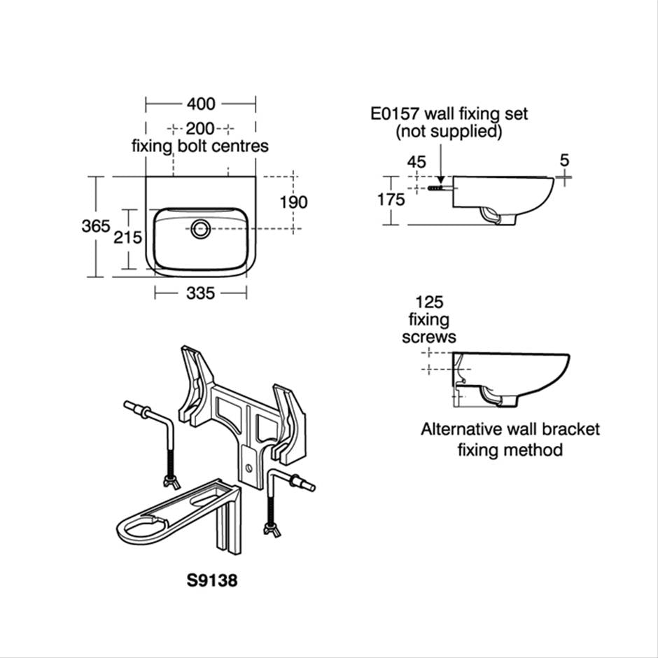 S9138 Bracket for 40cm basins Recommended fixing heights (floor to front rim); Nursery use 600mm Infant use 700mm Junior use 750mm Senior/adult use 780-800mm. Washbasin wall mounted using E015767 wall fixing set or panel mounted using E006267 fixing set