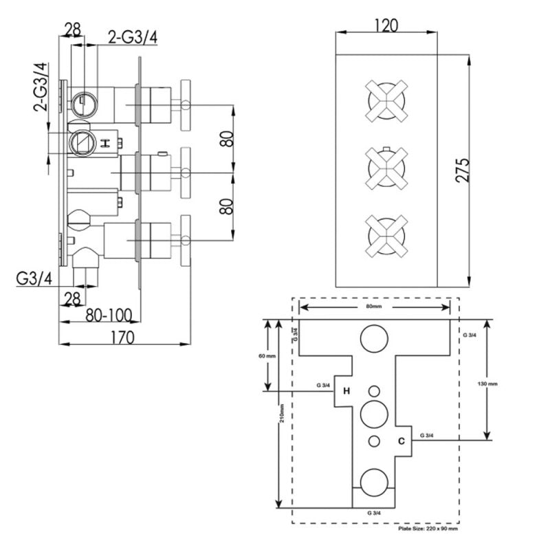 JTP Solex 3 Outlet 3 Handle Thermostatic Concealed Shower Valve – Chrome